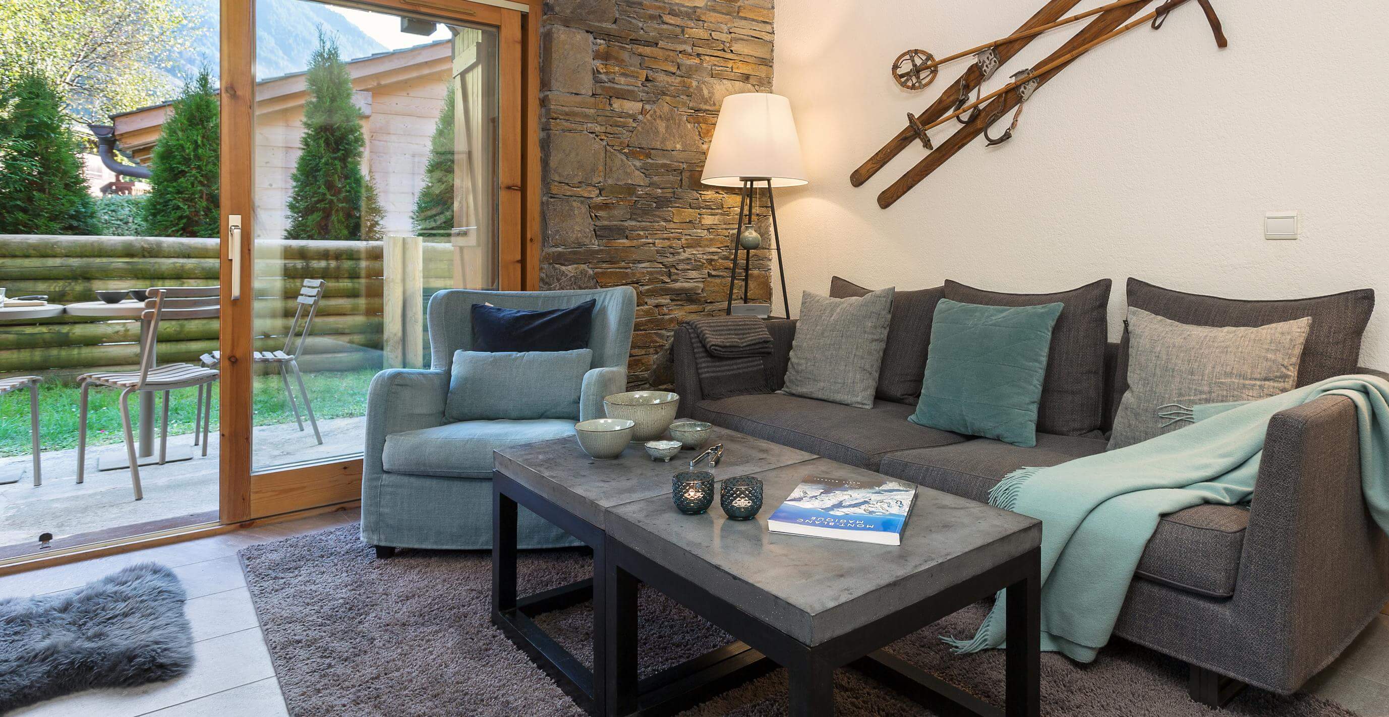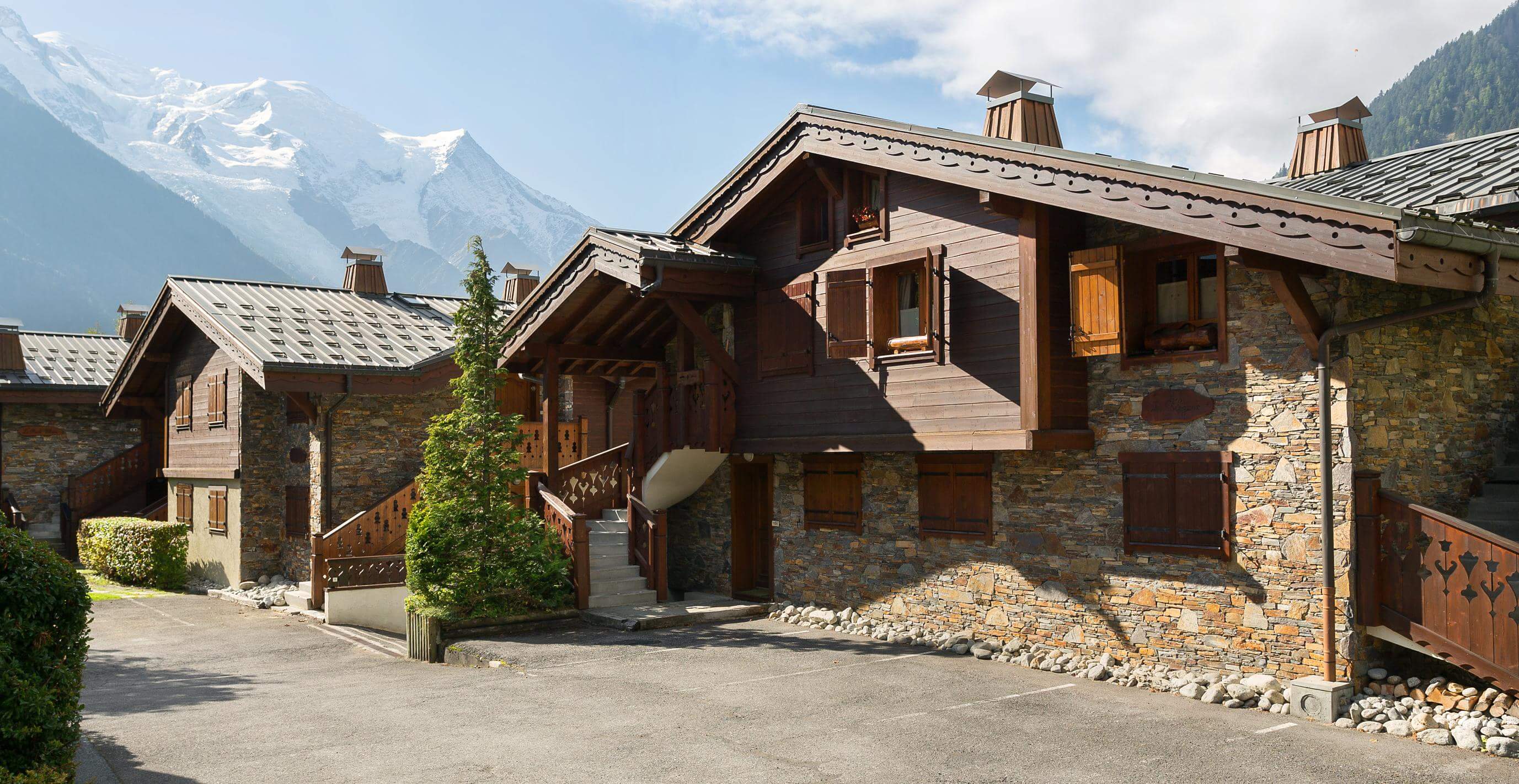 Bolig er beliggende i det fantastisk hyggelige område Les Praz med små hyggelige butikker og kort afstand til lifterne. Lejligheden ligger i stueetagen af denne forholdsvis nye og hyggelige bjælkeejendom. Boligen har en hyggelig terrasse og have mod syd, hvor der er plads til solstole og en grill - og med en suveræn udsigt til Mont Blanc.