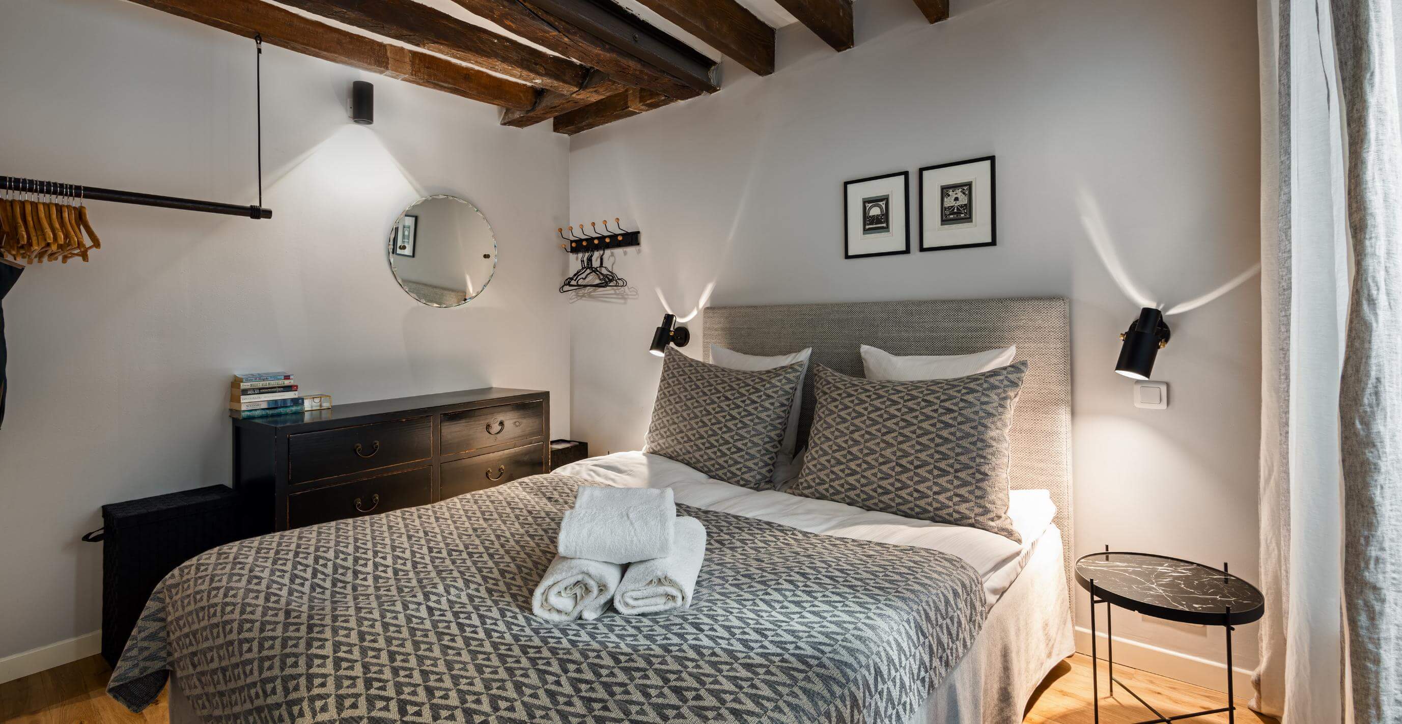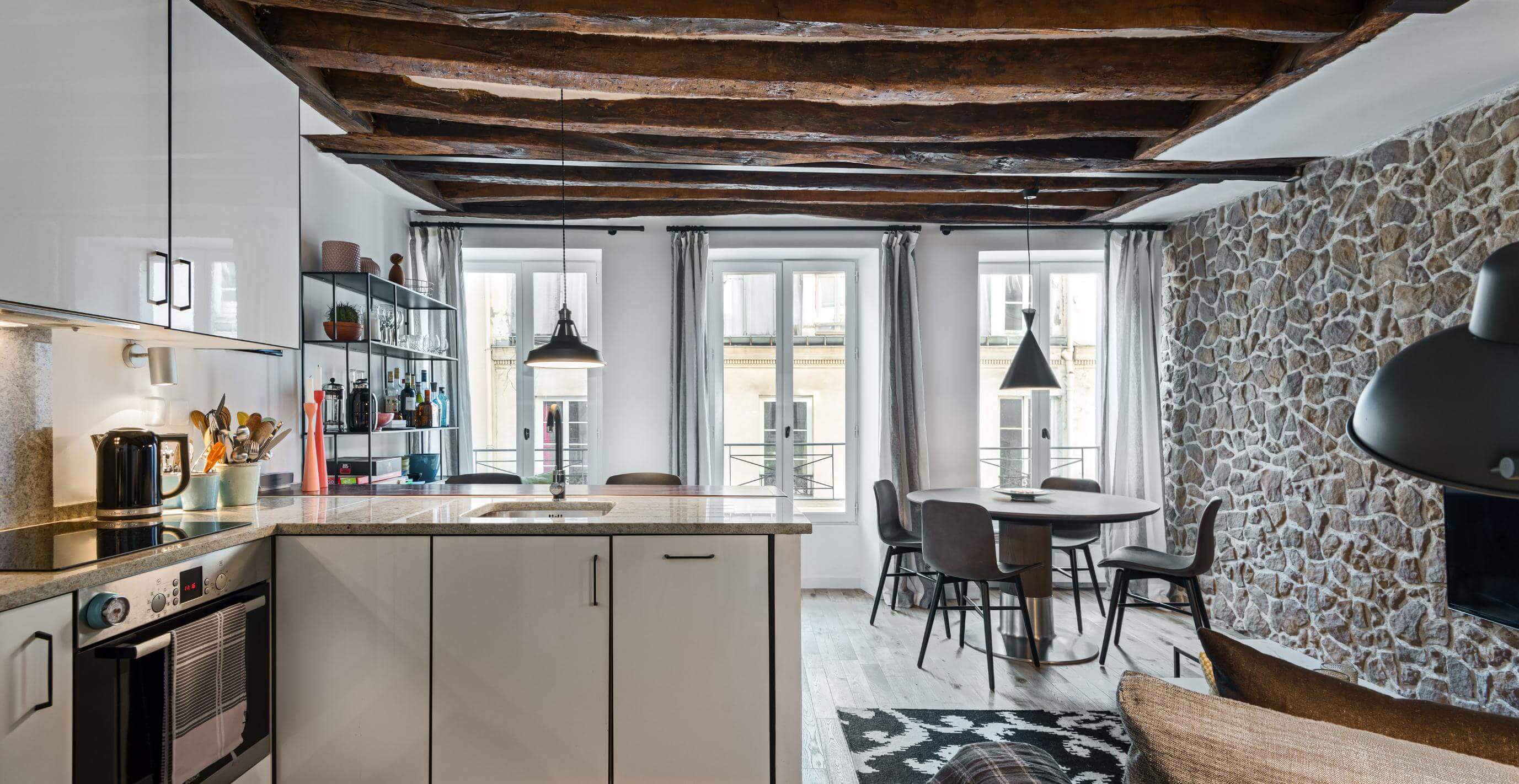 Bylejlighed beliggende lige ved Rue Montorgeuil i det 2. Arrondissement blandt smukke ældre bygninger, og hvor kulturoplevelserne er lige uden for gadedøren. Der er teatre, museer og et hav af restauranter og fortovscaféer, hvor man kan opleve den særlige parisiske atmosfære. Lejligheden har synlige loftsbjælker og et flot lysindfald.