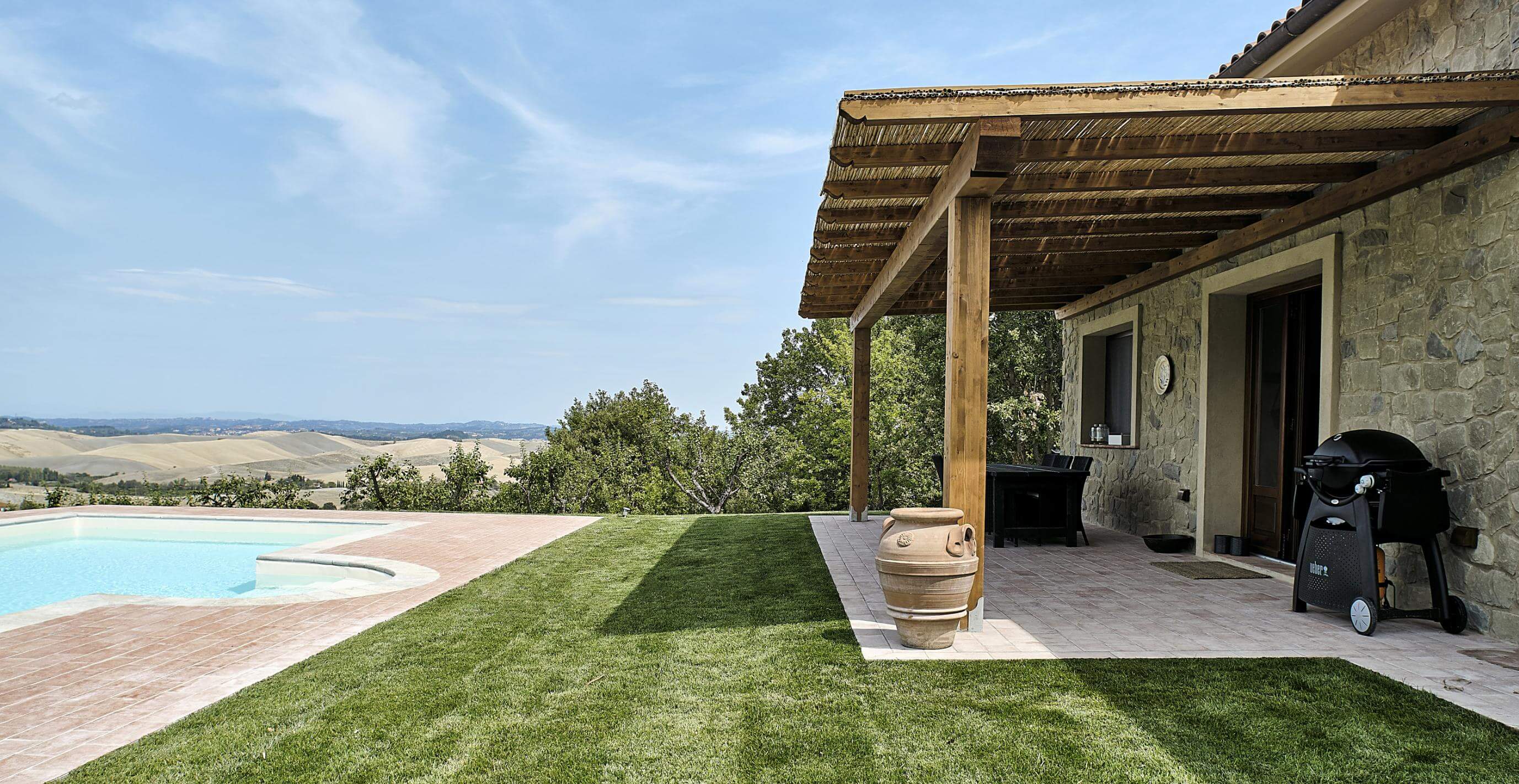 Indbydende landvilla med fantastisk udsigt og de grønne bakker og markerne i dalen. Beliggende tæt på en hyggelig lille by med flere restauranter og god kaffe. Der er en funktionel indretning og et dejligt lysindfald samt pergola, petanquebane og egen pool.