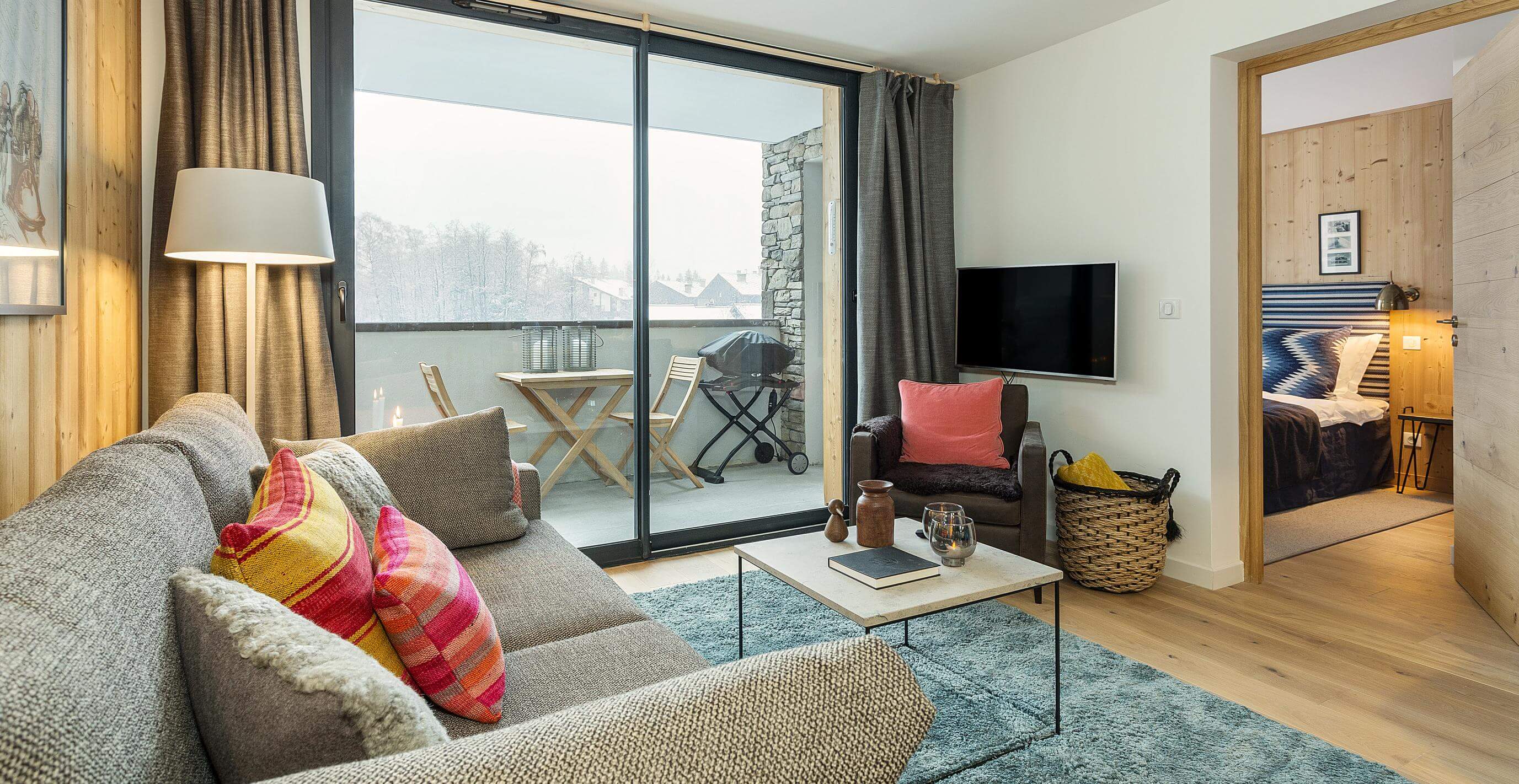 Med udsigt til Mont Blanc og beliggende i det naturskønne Les Praz tilbyder denne lejlighed både afslapning og oplevelser. Store vinduespartier, egen terrasse og adgang til fælles wellnessområde med pool og sauna skaber de perfekte rammer for både sommer- og vinteroplevelser i Alperne.