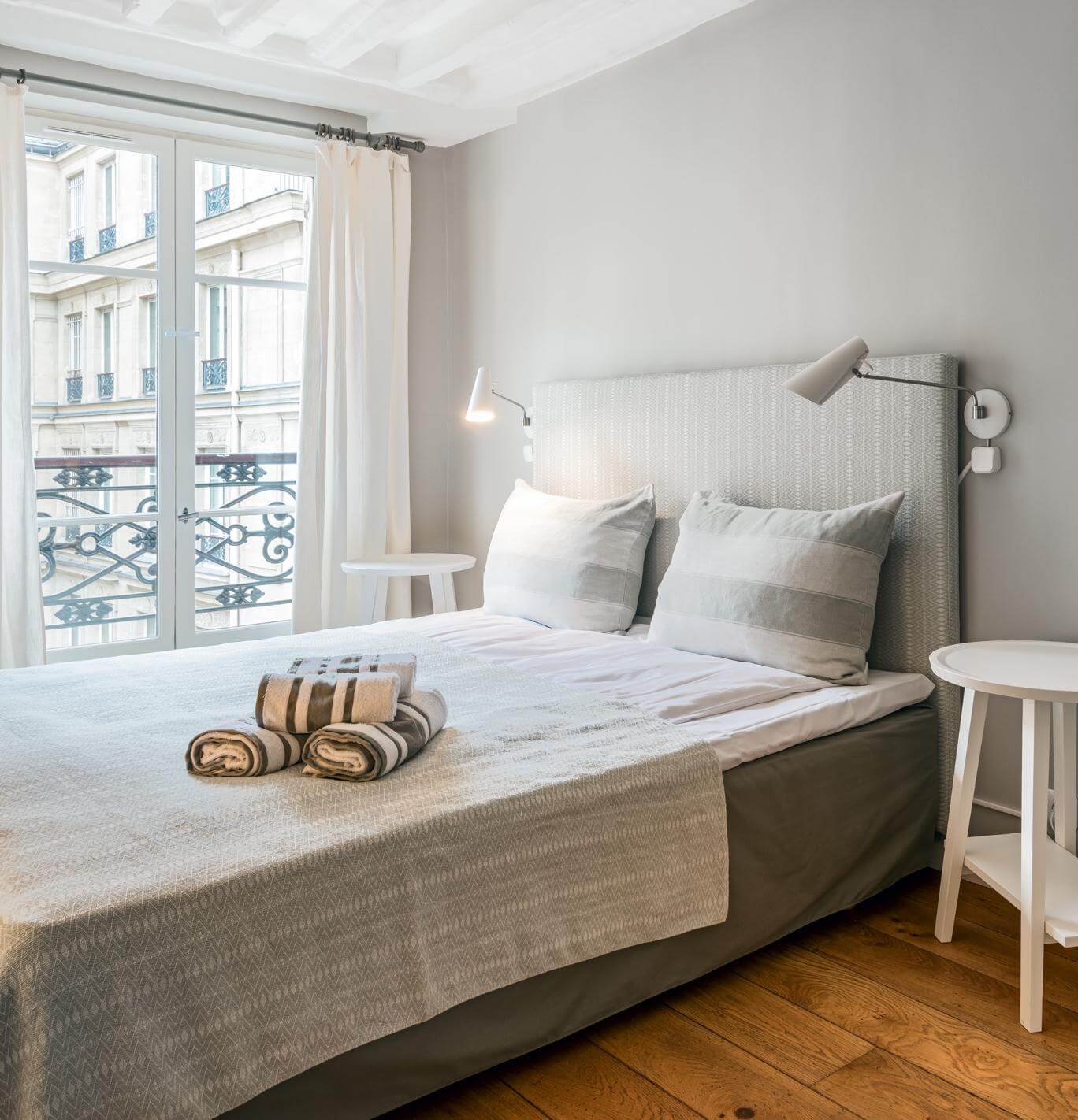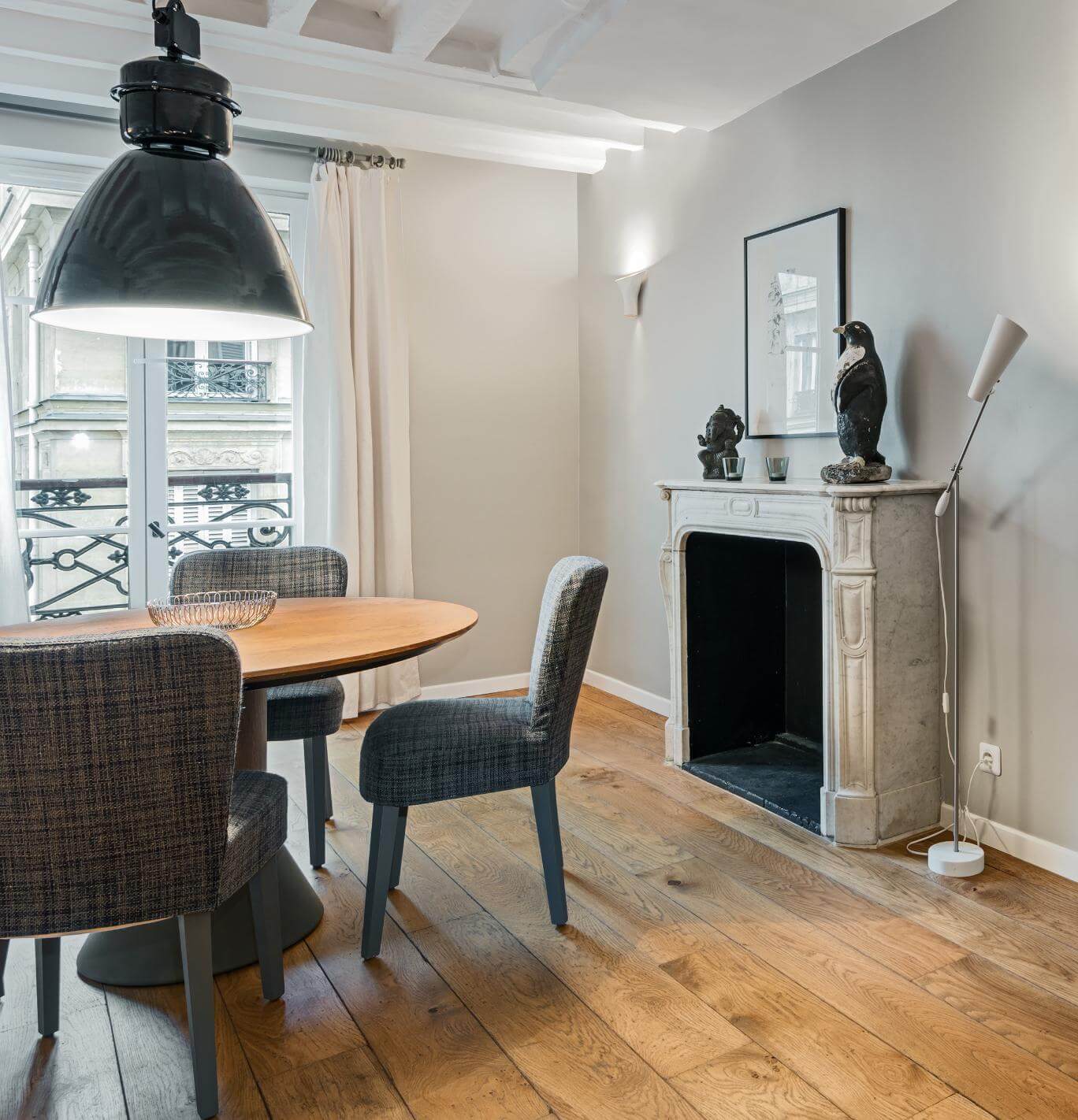Lejligheden fremstår i dag lys og indbydende med smukke trægulve, flotte vinduespartier med elegante franske altaner og et raffineret samspil mellem de grå vægge, de hvide paneler og de dekorative detaljer. Stuen er rummelig og indrettet, så lyset kan flyde frit, og det åbne køkken giver både funktionalitet og charme. Soveværelserne er enkle, rolige og gennemtænkte – perfekte til at trække sig tilbage efter en dag i byens pulserende gader. Selv de små detaljer – fra marmorkaminen til de moderne lamper – er valgt med øje for at forene klassisk parisisk æstetik med moderne komfort.