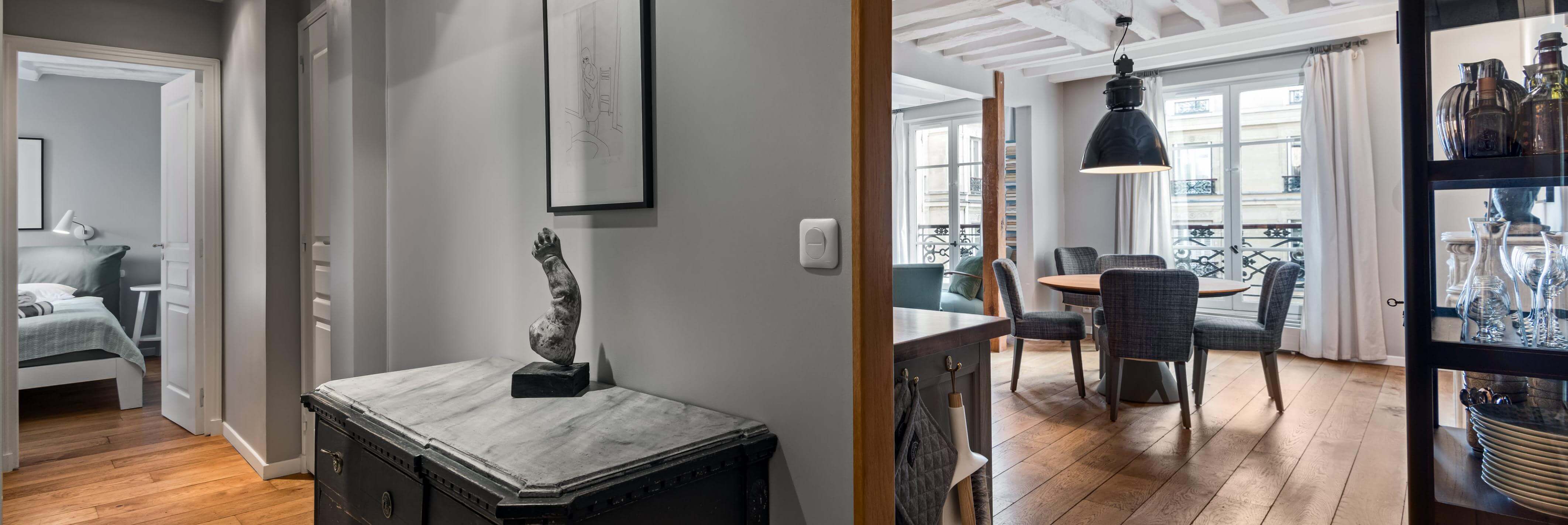 Placeringen kunne næppe være bedre: midt i hjertet af det 4. arrondissement, lige på kanten af Marais, med Rue de Rivoli rundt om hjørnet. Notre Dame ligger blot få skridt væk, og Bastillepladsen med sine caféer, markeder og historie er inden for gåafstand. Man bor her i et kvarter, hvor fortid og nutid smelter sammen – hvor gotiske tårne og moderne boutiques deler plads med lokale bagerier og små vinbarer.