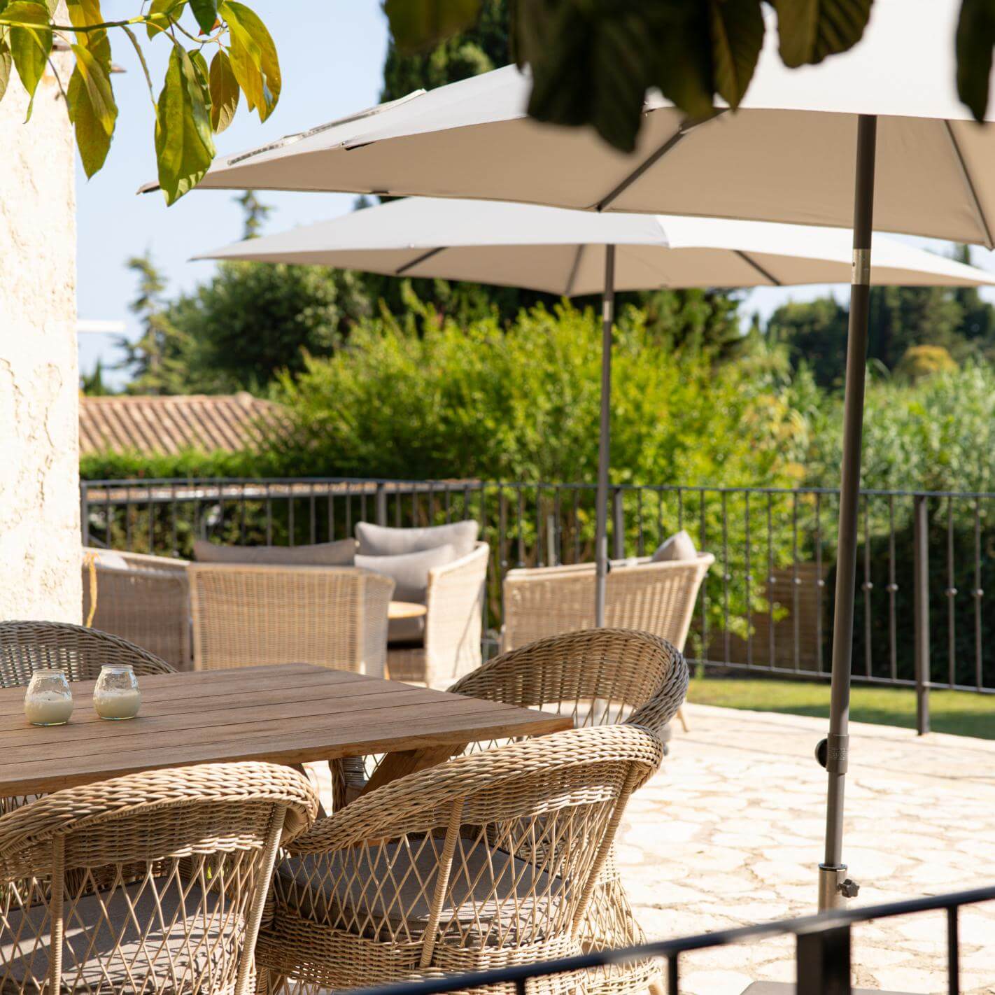 Haven er en oase i sig selv – med en skøn swimmingpool, flere solrige terrasser og små kroge, hvor man kan finde både ro og samvær. Man kan nemt forestille sig lange frokoster under parasollen, en rolig stund med en bog ved poolen eller en eftermiddagspetanque på gruset foran huset.