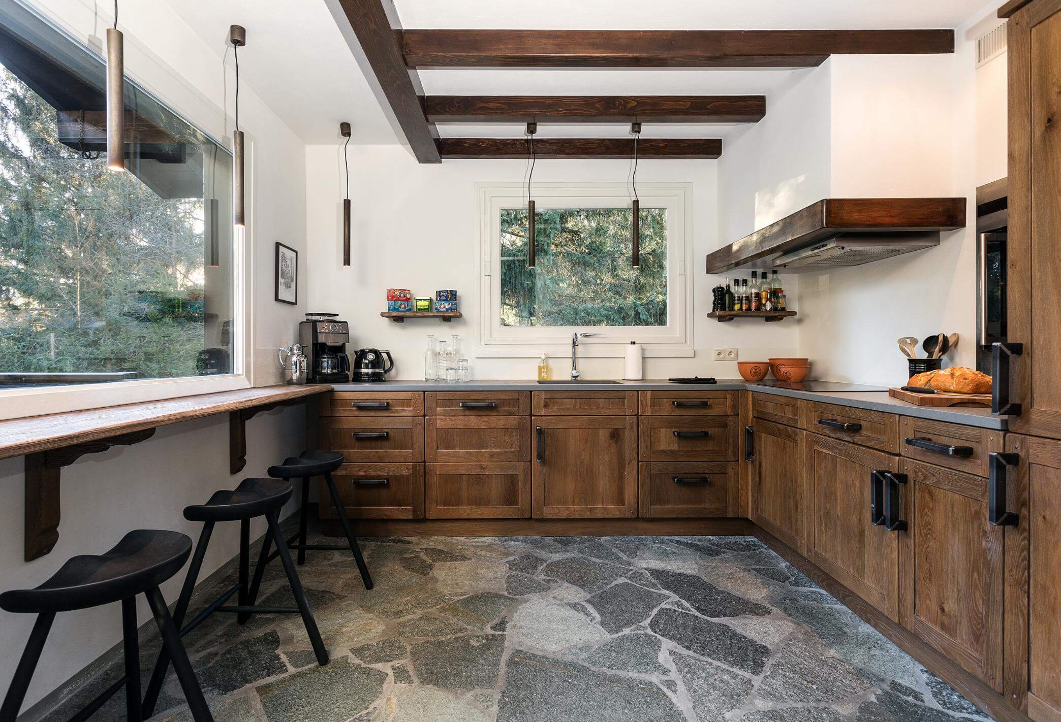 Ejendommen er sat i stand i forbindelse med købet, og resultatet er et hjem, der forener æstetik med funktionalitet. Det nye køkken er indrettet med en bar, hvor man kan sidde og nyde udsigten, mens maden bliver tilberedt. Spisestuen har et langt bord, der inviterer til hyggelige middage med familie og venner, og stuerne er indrettet med varme materialer og en indbydende atmosfære, som gør, at man straks føler sig hjemme. Soveværelserne og badeværelserne er velindrettede, lyse og komfortable – det hele er tænkt igennem, så chalet’et både er praktisk og drømmende på én gang.