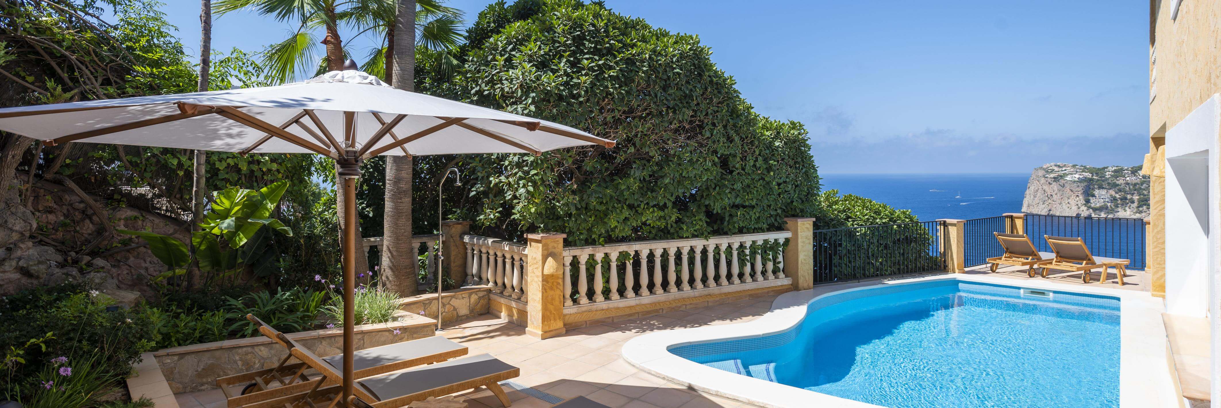 I Mallorcas sydvestlige hjørne, tæt på det charmerende Port d’Andratx, ligger bugten Cala Llamp – kendt for sit krystalklare vand, dramatiske klippeformationer og eksklusive atmosfære. Området er populært blandt sejlere, og fra kysten på bjergsiden hvor denne ejendom ligger - kan man følge livet på havet: både, der ligger for svaj i bugten, og sejlbåde og yachter, der sætter kursen mod nye eventyr på det åbne Middelhav.