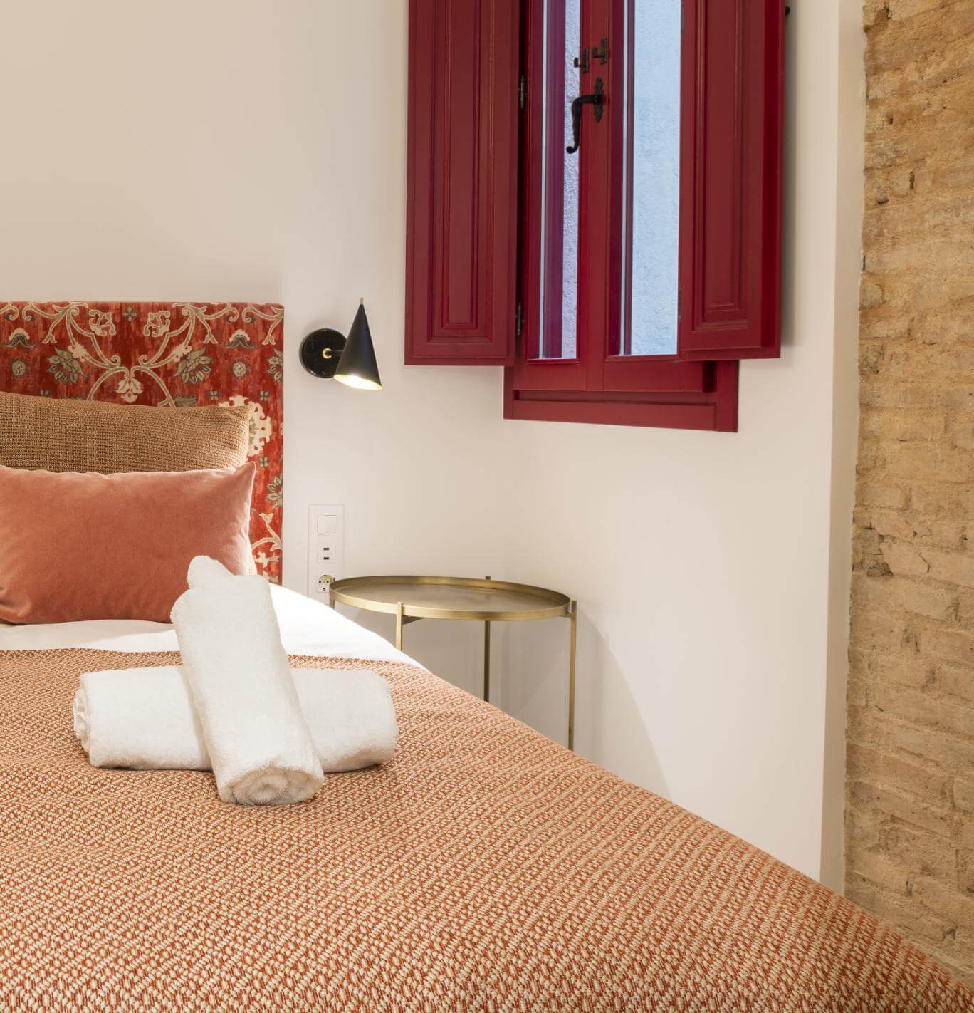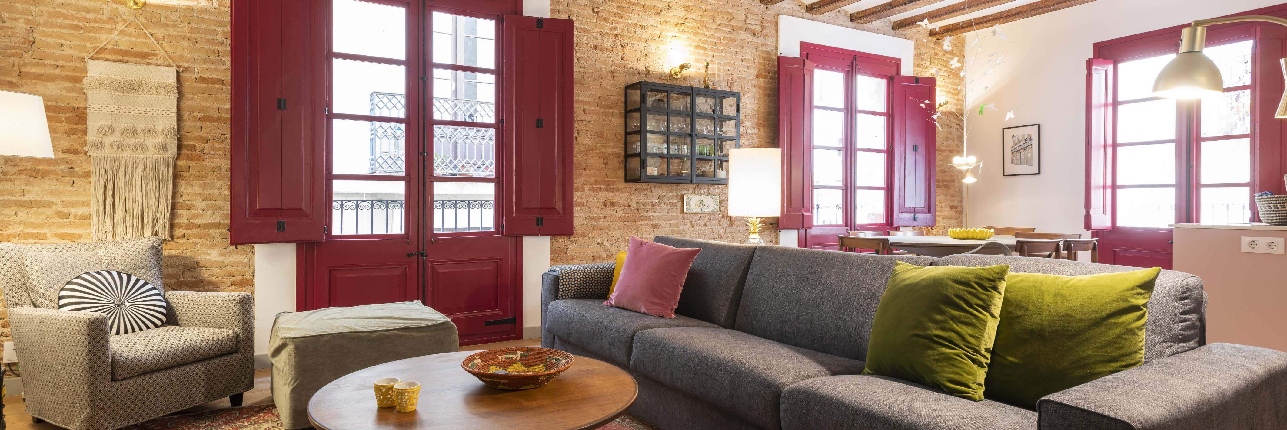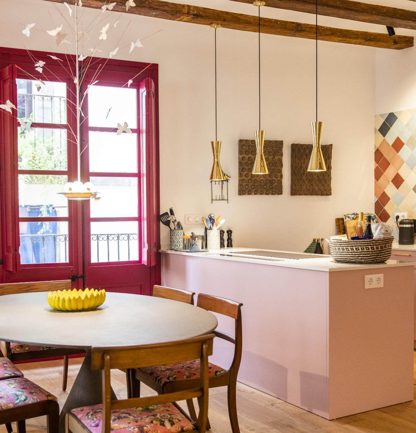Indenfor mødes man af en lejlighed, der med højt til loftet, fritlagte bjælker, smukke indvendige skodder og farverige detaljer udstråler den spræl og livsglæde, som netop kendetegner Barcelona. Kombinationen af originale elementer og moderne valg giver en stemning, der er både charmerende, levende og indbydende – en bolig skabt til at være en base for eventyr i byen.