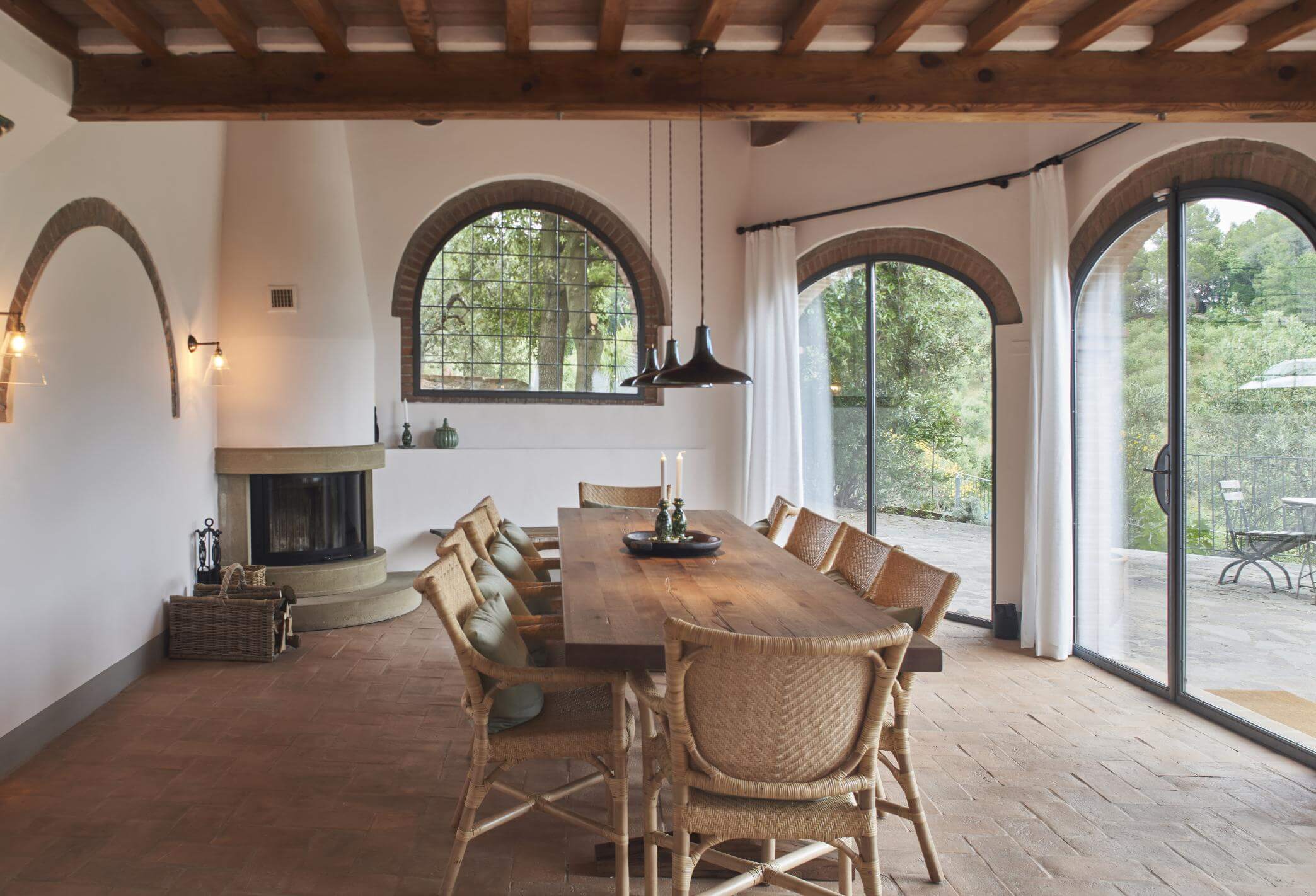 De store vinduespartier lukker lyset ind og åbner for den betagende udsigt, hvor bløde bakker strækker sig ud mod horisonten og afslører et strejf af Middelhavet i det fjerne. Ejendommen har flere terrasser med rigelig plads, perfekte til lange sommeraftener under den toscanske himmel. Indretningen er valgt med omhu og æstetisk sans, hvor hvert møbel og detalje understøtter følelsen af at være i Toscana – autentisk, smukt og tidløst.