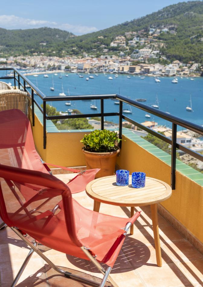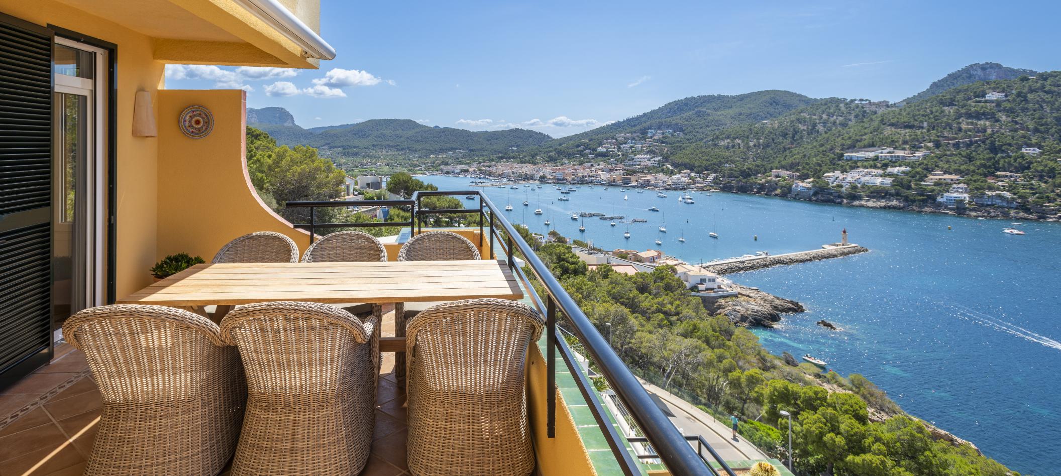 Denne sydvendte lejlighed på Mallorca byder på en spektakulær udsigt til havet og indsejlingen til Port d’Andratx. Der er 3 soveværelser, 2 badeværelser og en stor eksklusiv tagterrasse på 65 m². De rummelige udearealer, terrasser på begge sider og adgang til fælles pool gør boligen perfekt til ferie og samvær, og så er der gåafstand til lystbådehavnens restauranter.