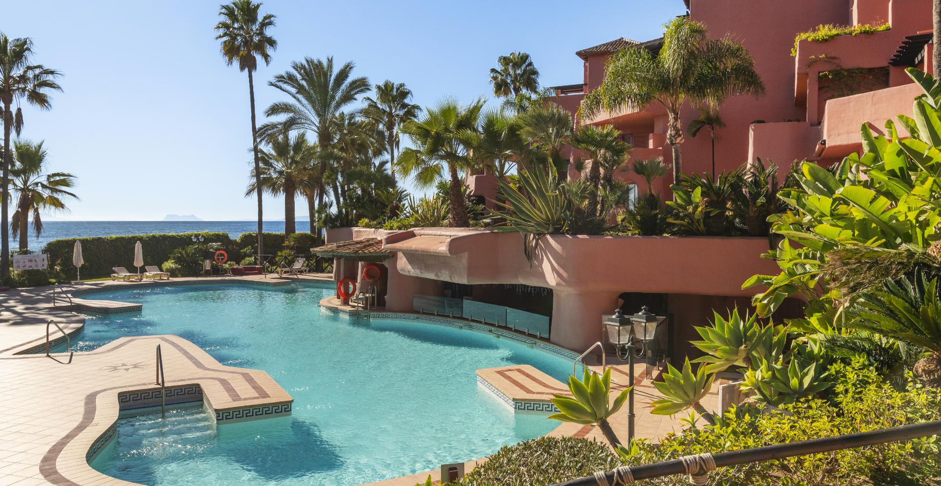 Mellem det autentiske Estepona og det pulserende Puerto Banús finder man Menara Beach – et af Costa del Sols mest attraktive boligområder, hvor Middelhavet bogstaveligt talt ligger for jeres fødder. Her er alt, hvad man drømmer om ved en feriebolig: direkte adgang til stranden, tropiske haver, palmer, der svajer i brisen, og et område, der er trygt, velplejet og fyldt med livskvalitet. Komplekset byder på en lang række faciliteter, som gør hverdagen både nem og luksuriøs. Flere indbydende pools, herunder en stor lagunepool, fitnessrum, sauna og hyggelige fællesområder skaber de perfekte rammer for afslapning. Alt er omkranset af smukke, frodige haver, der er passet og plejet med en detaljerigdom, som gør, at man straks mærker roen sænke sig. At bo her er at bo i en lille, eksklusiv oase, hvor sikkerheden er høj, og stemningen er afslappet.